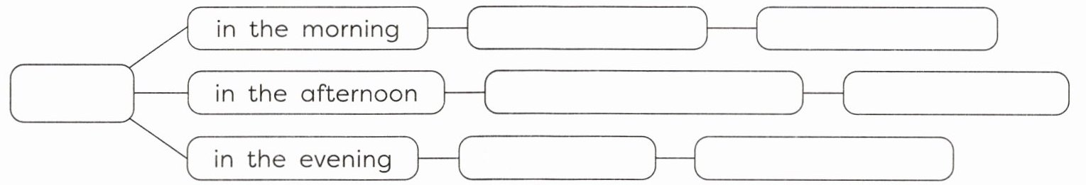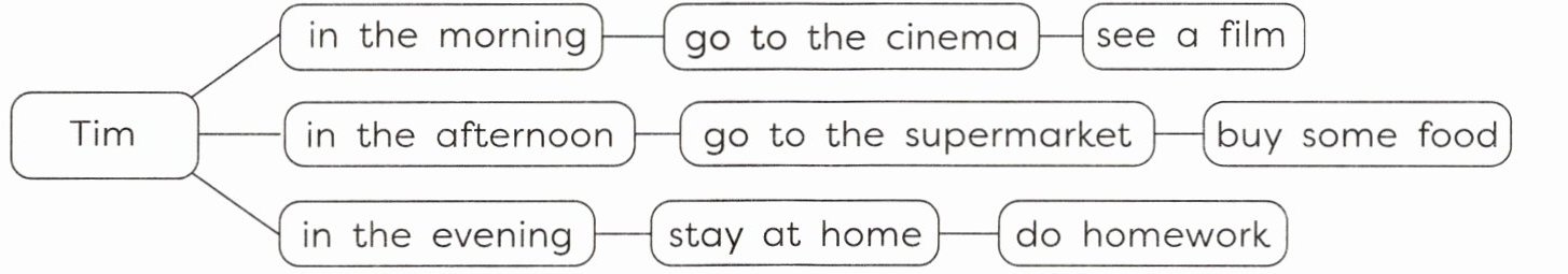 请根据思维导图帮助Tim介绍他周六的计划,再根据自己的实际情况完成思维导图,并完成写话。