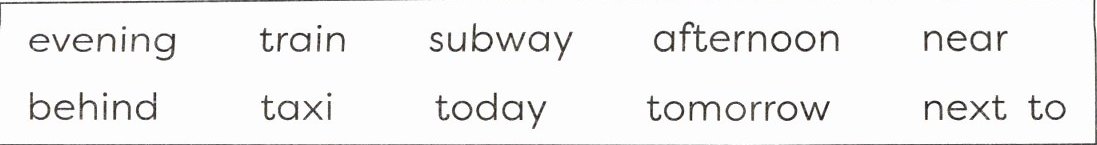 21. evening, afternoon, today, tomorrow 22. near, behind, next to 23. train, subway, taxi