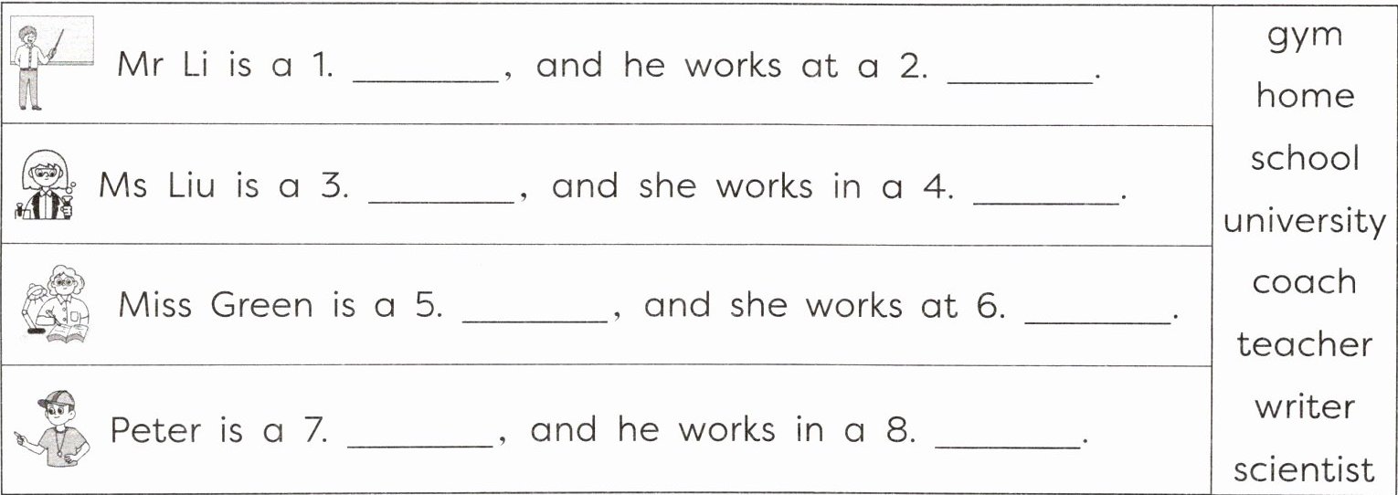 1. teacher 2. school 3. scientist 4. university 5. writer 6. home 7. coach 8. gym