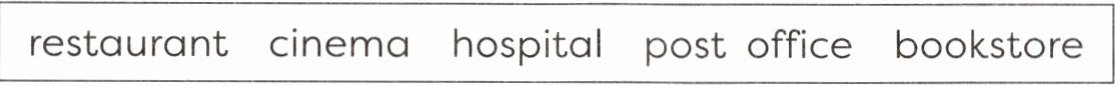 1. restaurant 2. post office 3. hospital 4. cinema 5. bookstore