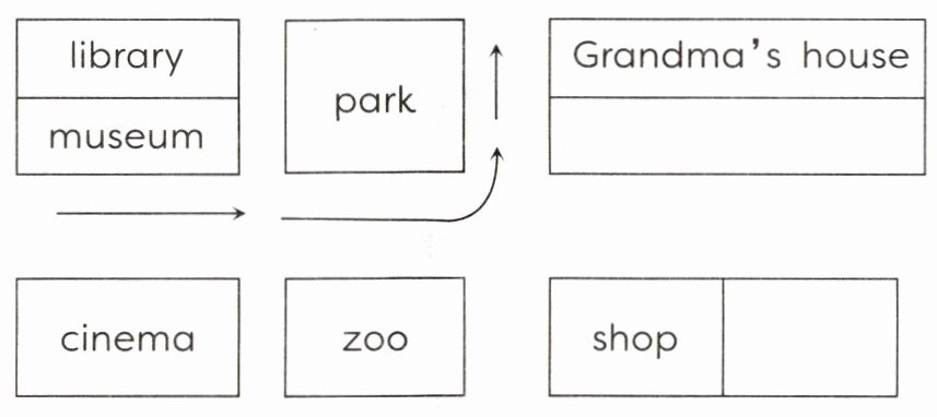1. I’m Amy. I want to visit my grandma. I will walk there. Now, I’m beside the cinema. First, I go straight on. Then, I turn left at the park. And I go straight on. My grandma’s house is on my right. 2. Now, I will go to the cinema from my grandma’s house. First, I go straight on. Then, I turn right at the park. And I go straight on. The cinema is on my left.