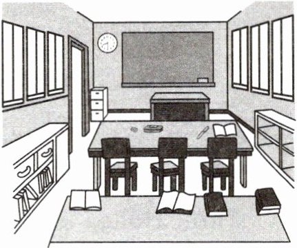 There is a blackboard in the classroom. There are three chairs and six windows. There is a clock. There are some books in my classroom.