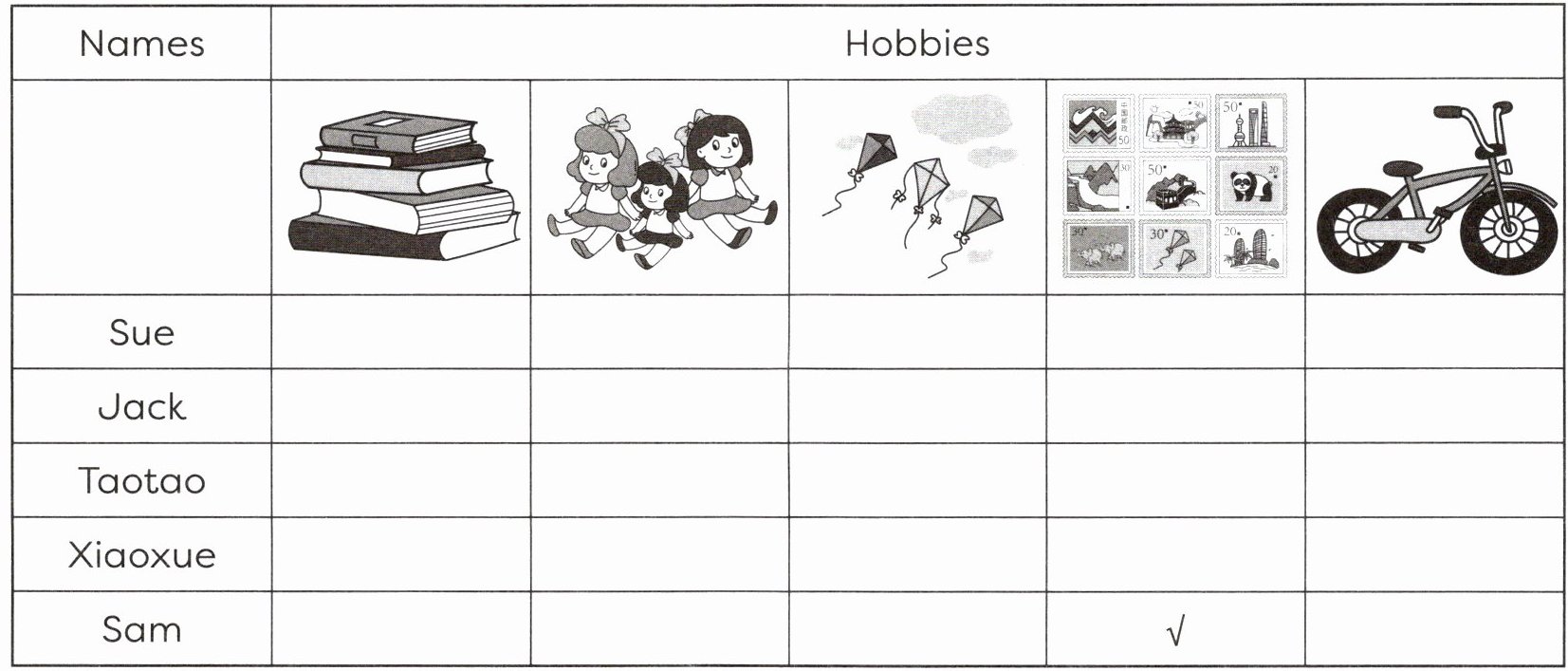 表格略 范文:This is my friend Sue. Collecting dolls is her hobby. This is Jack. Reading books is his hobby. This is Taotao. His hobby is flying kites. This is Xiaoxue. Her hobby is riding her bicycle. This is Sam. Collecting stamps is his hobby.