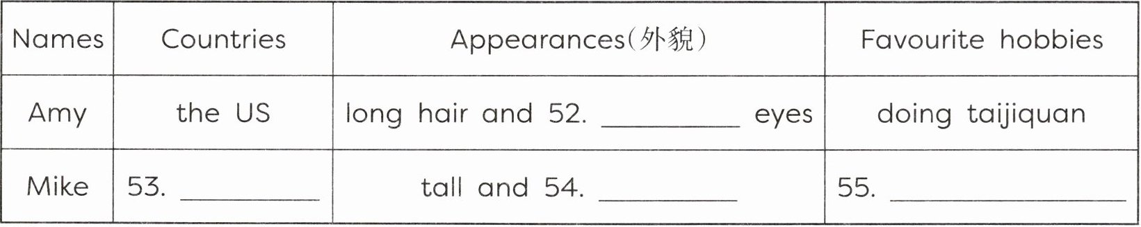 (一)51. Pen Friends 52. blue 53. the UK 54. thin 55. collecting stamps