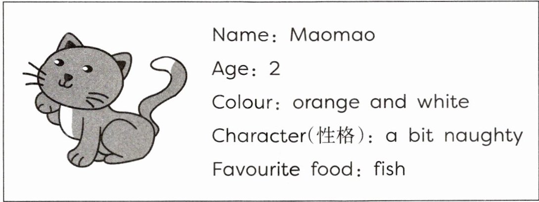 This is Ms Wang’s pet cat. It’s Maomao. It’s only two years old. It’s orange and white. It’s a bit naughty. Its favourite food is fish. I want to have a cat too.