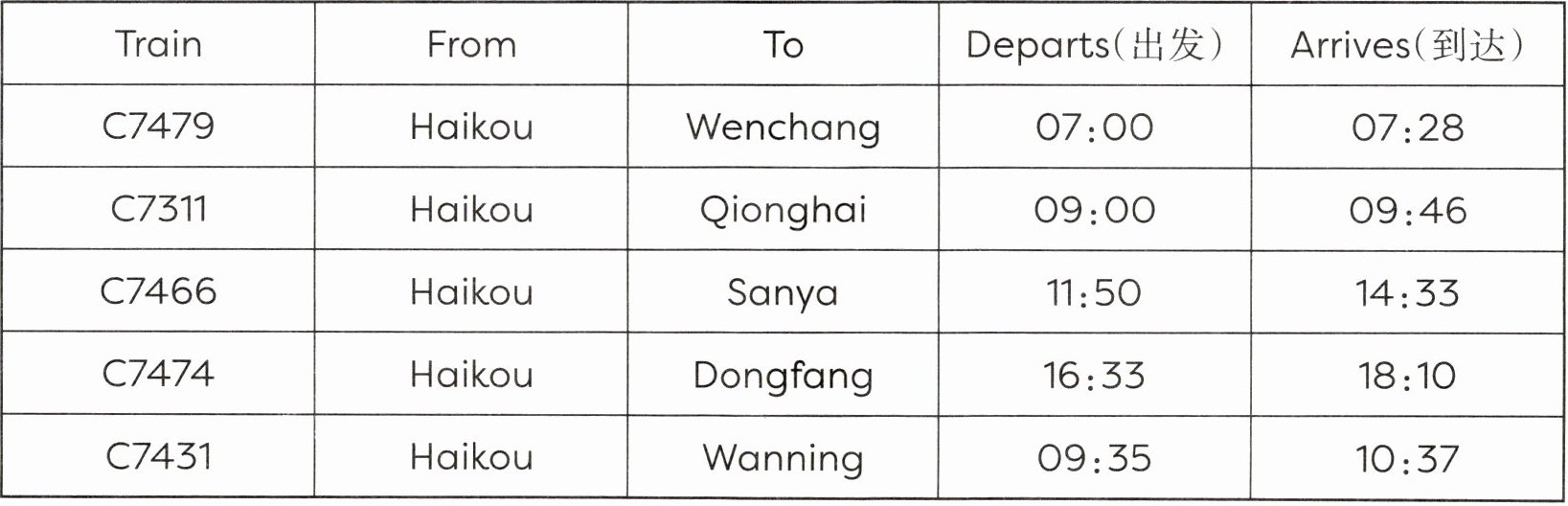 )2. When does Train C7311 leave Haikou?A. At 09:30. B. At 09:00. C. At 09:46.