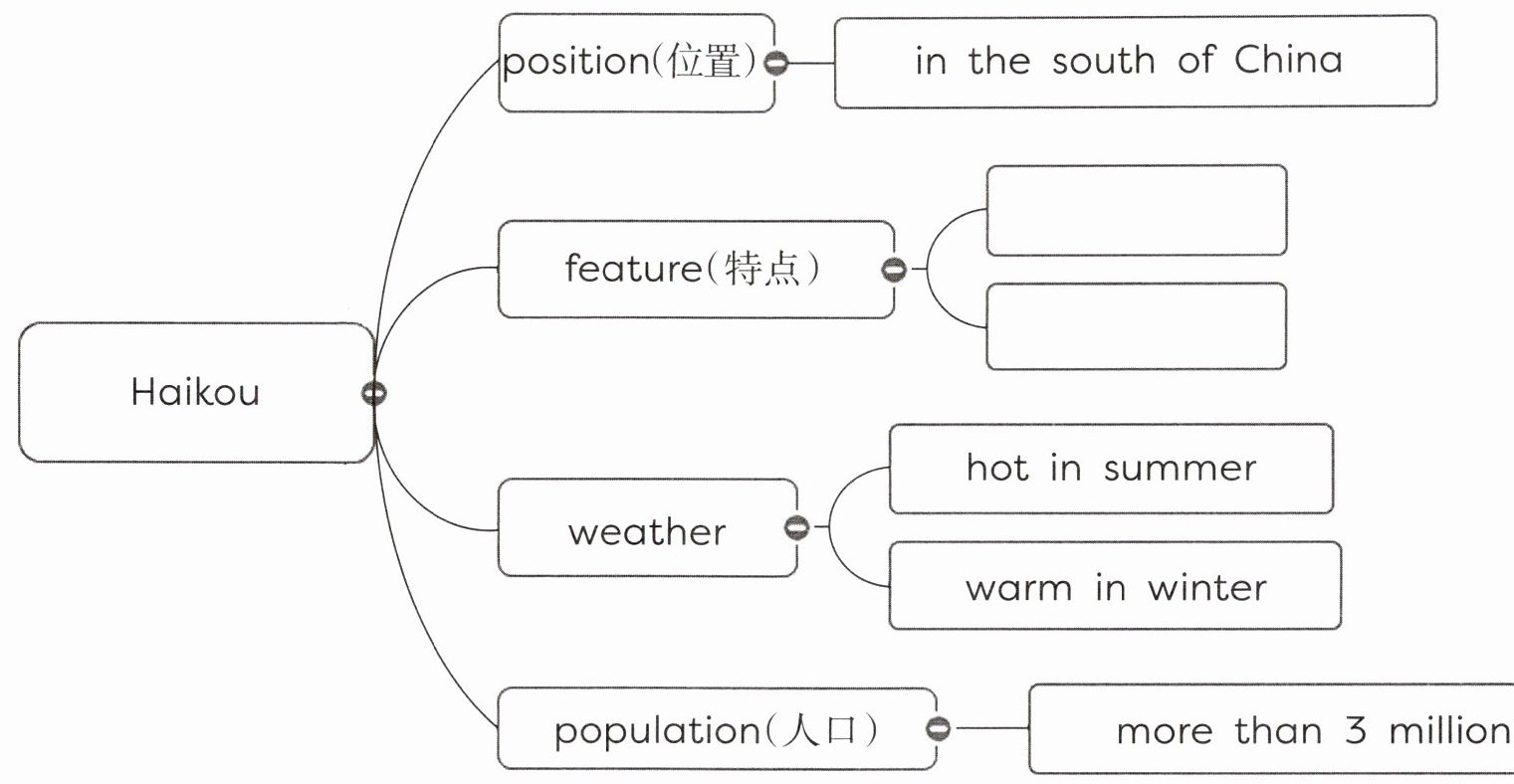 思维导图略 范文:I'll tell you something about Haikou. It is in the south of China. It is beautiful and clean. It's hot in summer and warm in winter. It has got more than three million people. Welcome to Haikou.
