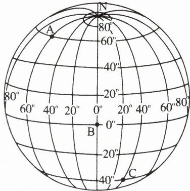 (2)图中A、B、C三地中,位于南、北半球分界线上的是____地,位于东半球的是____地,位于西半球的是____地。