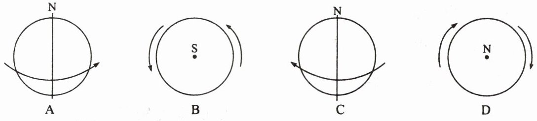 2. 下列四幅图,能正确表示地球自转方向的是( )。