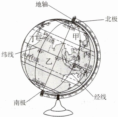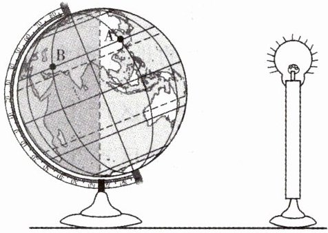 3. 地球仪是地球的模型,将下图所示的地球仪按地球自转方向转动,四点中最早从我们的视线中消失的是( )。