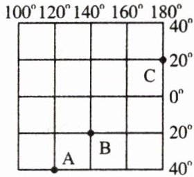 ① A点的经度是120°E,C点的纬度是20°N ② C点位于五带中的热带