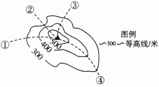 某班学生计划分成四个登山活动小组,目标是右图中所示的山峰,分别沿图中的①②③④虚线方向进行攀登。据此完成 3~4 题。