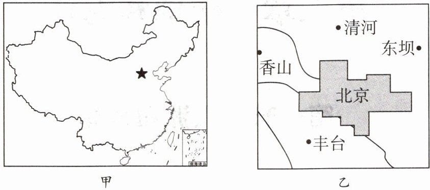 D.乙图中的香山位于丰台区的西北方向