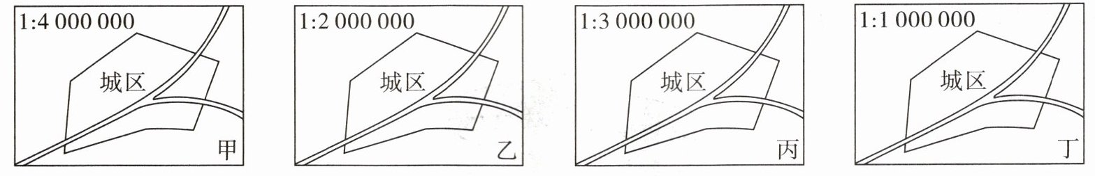 D 比例尺是个分数,比较比例尺的大小,先把所有的比例尺都写成分数的形式,在分子相同的情况下,分母越大,分数越小,也就是比例尺越小;反之,分母越小,分数越大,也就是比例尺越大。比较选项中各分母可知,比例尺由大到小依次为:丁>乙>丙>甲。在图幅相同的条件下,比例尺越大,表示的范围越小,内容越详细;比例尺越小,表示的范围越大,内容越简略。据此可判断:四幅图中,城区面积最小的是比例尺最大的丁。