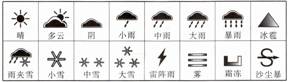 一个太阳是晴天,一片雪花是小雪。一条闪电雷阵雨,小雨落在乌云下。乌云在前是阴天,太阳躲在多云后,三条黑线是下雾,半个冰箱是霜冻。