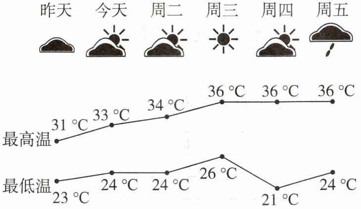 A. 昨天的天气是阴天,最高温与最低温相差10℃