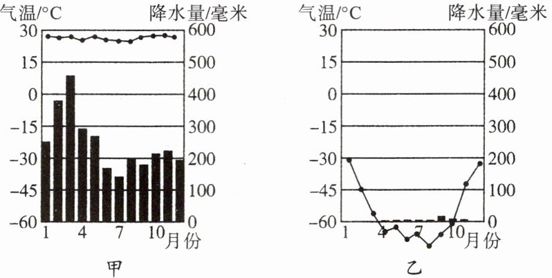 2. 读甲、乙两地气温曲线和降水量柱状图,回答下列问题。