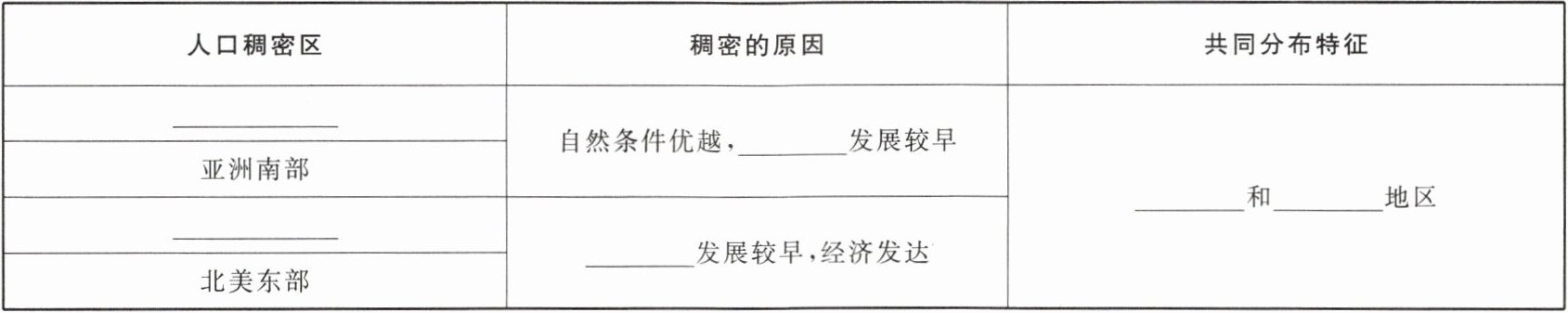1. 人口的疏密程度用______来表示;人口密度 = $\frac{某区域的人口数(人)}{该区域的面积(平方千米)}$