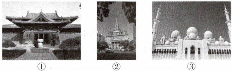 (1)甲信奉______教,他在______(填数字)建筑中祈祷;乙信奉______教,他在______(填数字)建筑中祝福;丙信奉______教,他在______(填数字)建筑中祈福。
