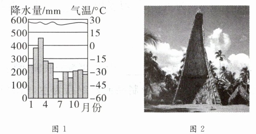 【民居与环境主题题】“A”形茅屋是巴布亚新几内亚的传统民居,因其外形酷似字母“A”而得名。图1为巴布亚新几内亚气温曲线和降水量柱状图,图2为“A”形茅屋景观图。据此完成3~4题。