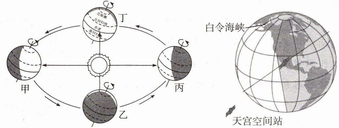 2023年10月26日,“神舟十七号”载人飞船成功发射,于2024年4月30日返回地面。下图示意地球公转及天宫空间站在太空的位置,读图,完成19~20题。