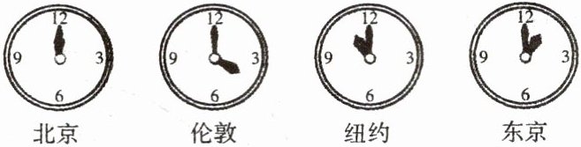 15. 贝贝到上海旅游,看见宾馆大厅的四个时钟(如下图),同一时刻四个城市时间不同的原因是( )。