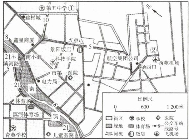 23. (6分)读某城市部分城区分布图,回答下列问题。