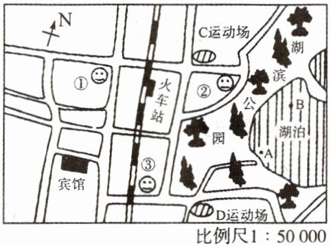 (3)周六三名同学相约在湖泊西南方向的运动场附近会合,这个运动场是指______(填字母)运动场。