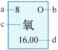 1. 在元素周期表中,每种元素在表中排列的序号称为______,它等于该元素原子的核内______(核电荷数),例如碳元素的原子序数是6,其核内有______个质子。右图是氧元素在元素周期表的信息,a表示______,b表示______,c表示______,d表示______。