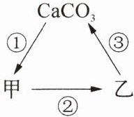 3. 于谦的《石灰吟》中有诗句“千锤万凿出深山,烈火焚烧若等闲”,其中蕴含着石灰石分解的原理(如图示中的①,“→”表示物质间的转化关系,甲、乙中含有相同的金属元素)。下列说法正确的是( )