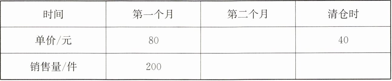 6. 某批发商以每件50元的价格购进800件T恤. 第一个月以每件80元的价格销售,售出了200件;第二个月如果单价不变,预计仍可售出200件. 批发商为增加销售量,决定降价销售,根据市场调查,单价每降低1元,可多售出10件,但最低单价应高于购进的价格,第二个月结束后,因急需资金周转,批发商将剩余的T恤以单价40元一次性清仓处理. 设第二个月单价降低了x元.