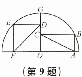 9. 如图,点A、F在半圆的直径上,且OA>OF,四边形OABC、ODEF均为矩形. 设AC= m,DF= n,则m、n的大小关系是(