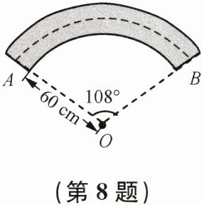 8. 如图,一弯形管道的中心线是一段圆弧$\overset{\frown}{AB}$.已知半径$OA= 60$cm,$\angle AOB= 108^{\circ}$,求管道的长度(即$\overset{\frown}{AB}$的长,结果保留$\pi$).