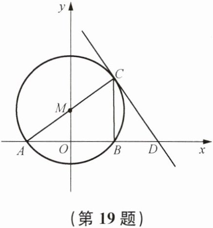 19. 如图,点M的坐标为$(0,\sqrt{3})$,⊙M与x轴交于A、B两点,AC是⊙M的直径,过点C的直线交x轴于点D,直线CD相应的一次函数表达式为$y= -\sqrt{3}x+5\sqrt{3}$.