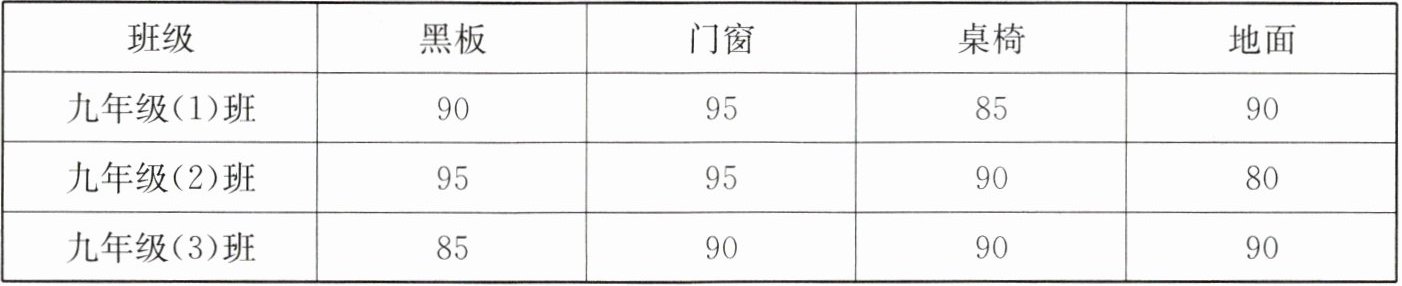 8. 某校对各班级教室卫生情况的考核包括以下几项:黑板、门窗、桌椅、地面.某天九年级3个班各项成绩分别如下(单位:分):