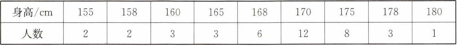 $总身高 = 155× 2 + 158 × 2 + 160 × 3 + 165 × 3 + 168 × 6 + 170 × 12 + 175 × 8 + 178 × 3 + 180 × 1$