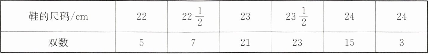 解:观察表格可知,鞋的尺码为$23\frac{1}{2}$cm的双数最多,为$23$双。