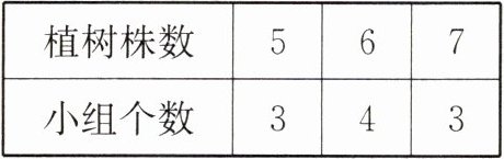 根据表格,植树5株的小组有3个,植树6株的小组有4个,植树7株的小组有3个。