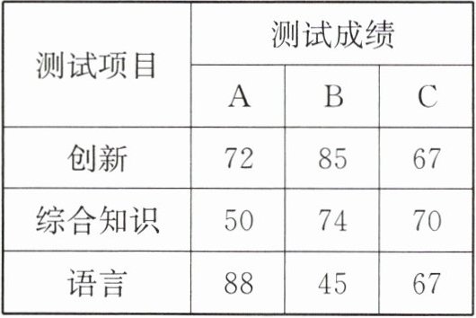 (2) 根据实际需要,如果公司将创新、综合知识和语言3项测试成绩按4:3:1的比例计算各人的总成绩,那么谁将被录用?