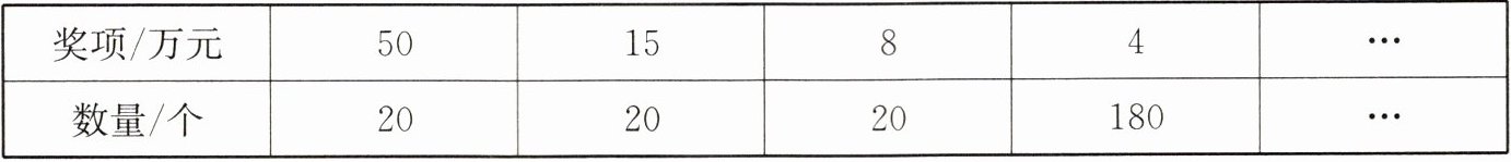 解:中不少于8万元大奖的奖项为50万元、15万元、8万元,其数量分别为20个、20个、20个。