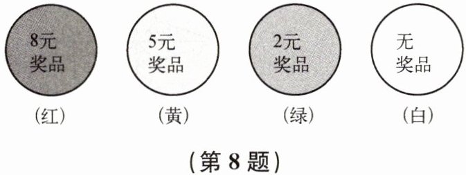 8. 在一只黑色的口袋里装有除颜色外都相同的50个小球,其中红球1个、黄球2个、绿球10个,其余为白球.充分搅匀后,任意摸出1个球.如图,奖品的情况标注在球上.