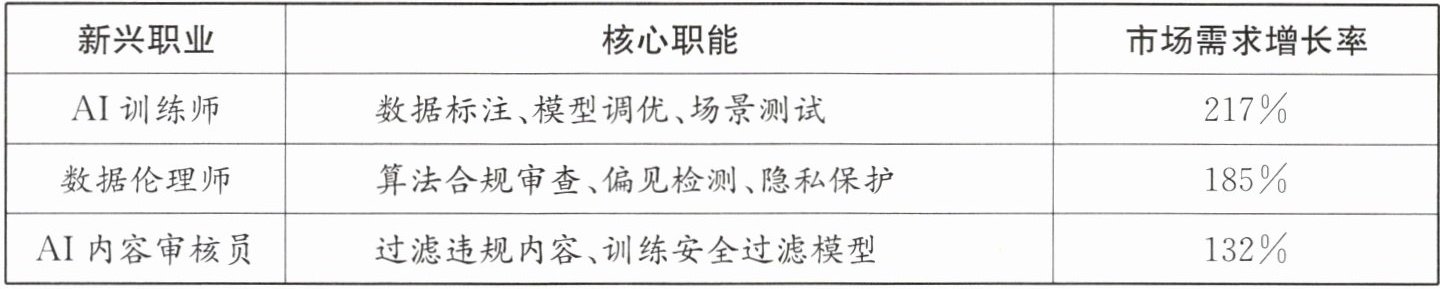 互联网技术的发展,促进了AI深入应用,新兴职业层出不穷。这些职业的出现对社会产生的影响有 ()