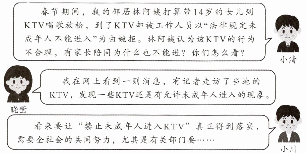 (2)①KTV工作人员的言行是正确的。法律明确规定KTV等娱乐场所不得允许未成年人进入,工作人员拒绝未成年人进入,是遵守法律规定、履行法定义务的表现,体现了依法办事的法治观念。②林阿姨的言行是错误的。她未认识到法律的强制性规定,即使有家长陪同,法律禁止未成年人进入KTV的规定依然适用,其行为反映出法治观念薄弱,需要增强法律意识,自觉遵守法律。