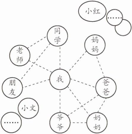 1. 在学习了《丰富的社会生活》一课后,小华试着绘制了自己的社会关系网络圈图(见右图)。通过观察该图,我们能够发现