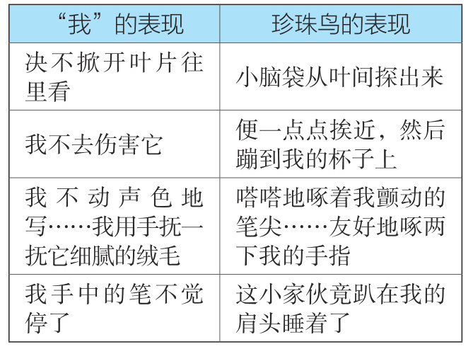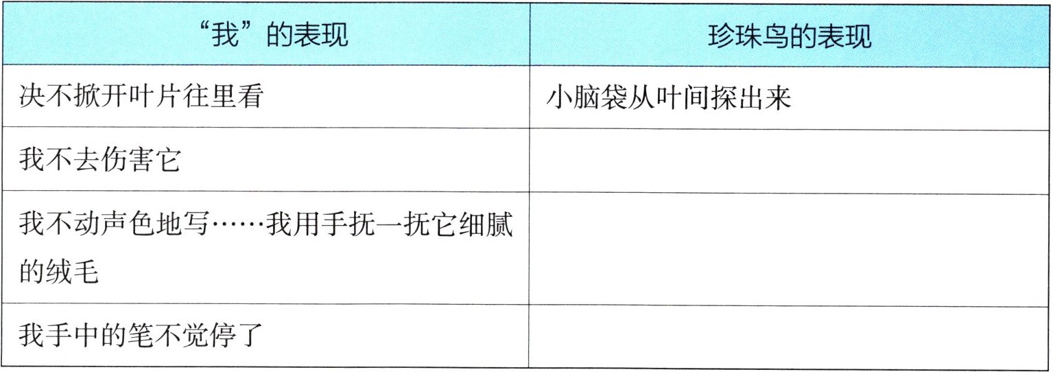 三、默读课文,想想“我”是怎样逐渐得到珍珠鸟的信赖的。梳理课文内容,用关键词句把下面的表格补充完整。