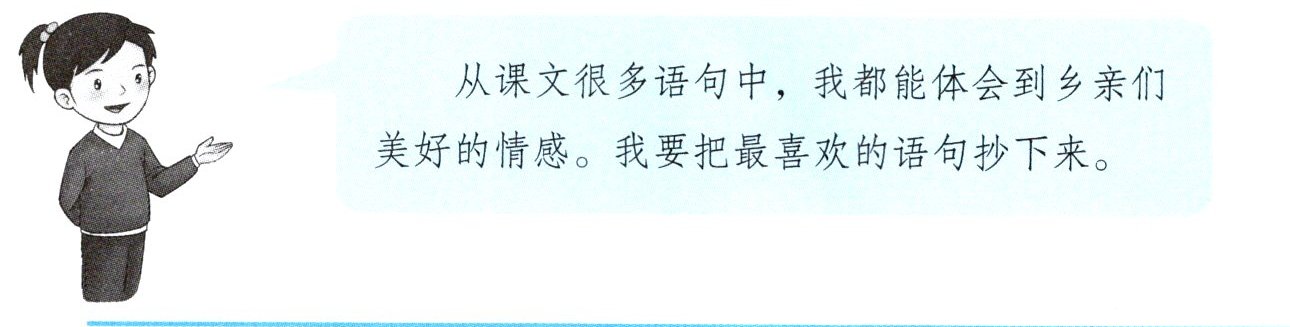 从课文很多语句中,我都能体会到乡亲们美好的情感。我要把最喜欢的语句抄下来。
