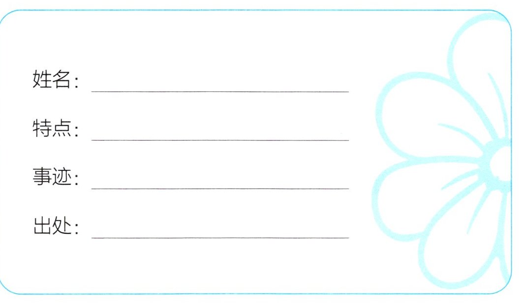 七、课外你一定阅读了不少民间故事,认识了一些有鲜明特征的故事人物。请你为自己最喜欢的一个人物设计一张名片,可以从姓名、特点、事迹、出处等方面进行介绍。