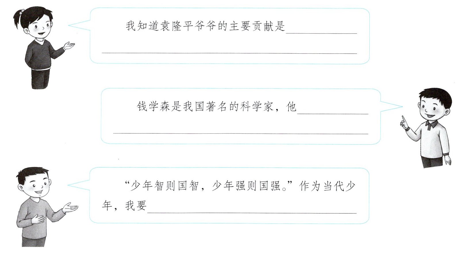 [示例] 袁隆平:研究杂交水稻,保障国家粮食安全。钱学森:为中国的航天事业、国防事业作出了卓越且不可磨灭的贡献。 刻苦学习,努力锻炼,准备为祖国作贡献。(意思对即可)