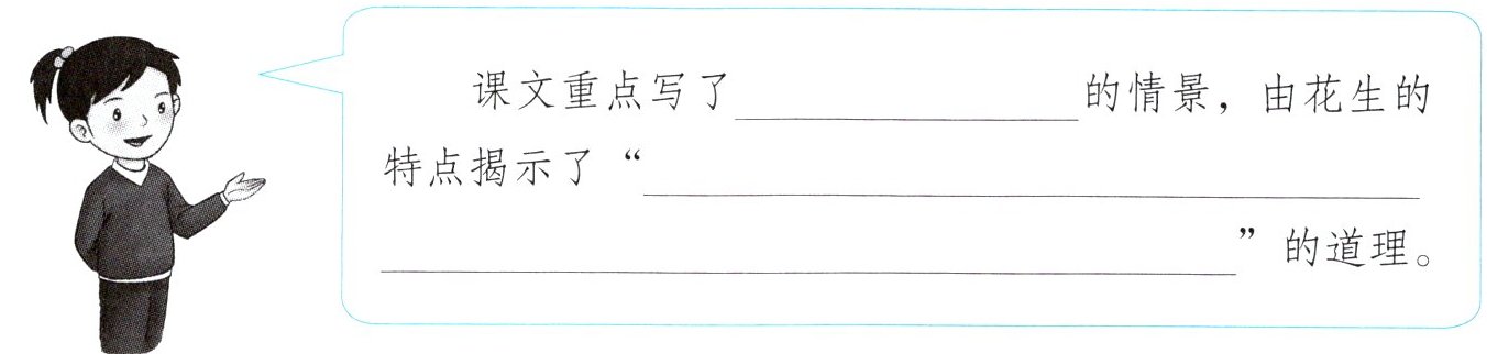 四、想一想课文围绕“落花生”写了哪些内容,概括填写在方框里。