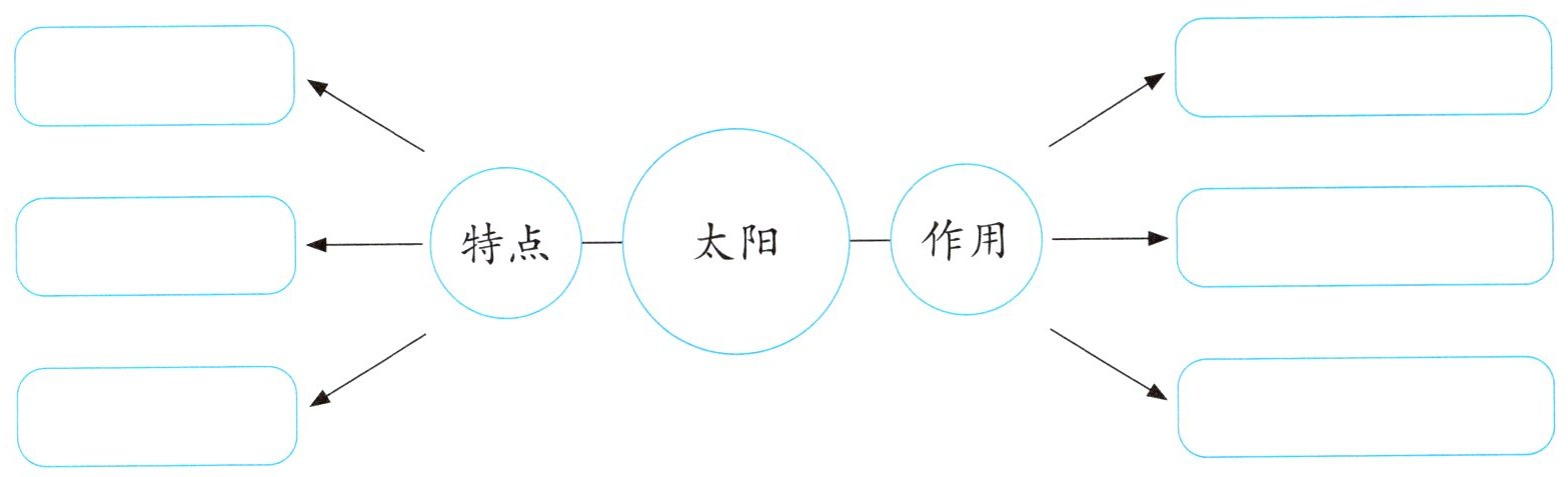 四、回顾课文内容,想想课文介绍了太阳的哪些特点、太阳对人类有哪些作用。请试着把下图补充完整。